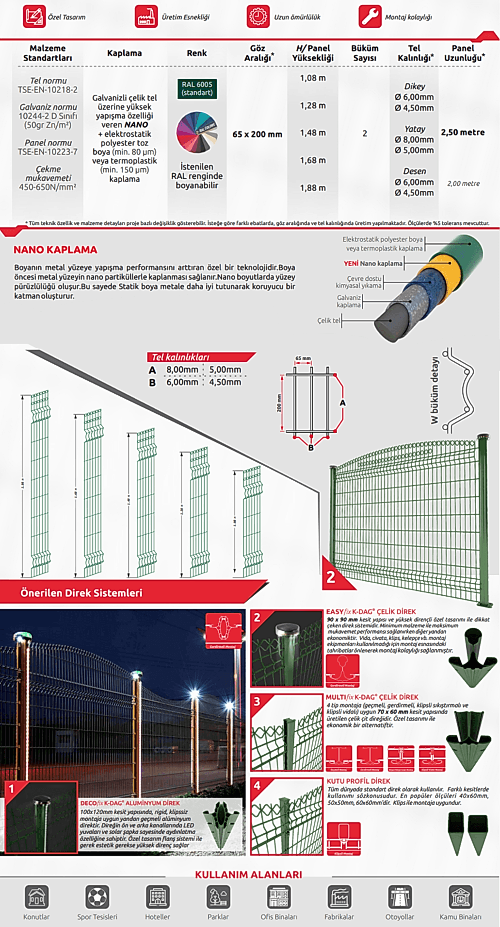 Kösedağ, piyasadaki en göz alıcı ve dekoratif çit ürünlerini sunmak için en son tasarım teknikleriyle birlikte en en iyi çelik ve kaplama malzemelerini kullanır. Kösedağ'ın Deco Çit Çözümleri, çeşitli göz aralığı tasarımlarında, üst yüzeylerde, renklerde, yüksekliklerde mevcuttur ve çit ürünlerinin geleneksel montaj yöntemlerini ortadan kaldıran benzersiz K-DAG gerdirmeli montaj sistemli direklerimiz ile sağlanabilir. Kösedağ Deco Çit Ürünleri, paneli direğe bağlamak için herhangi bir mekanik bağlantı elemanı kullanmaya gerek kalmadan monte edilebilir. Bir diğer çok benzersiz özellik ise, herhangi bir elektrik altyapısı kurmak zorunda kalmadan çit hattını aydınlatabilen güneş ışığı direk şapkasıdır!