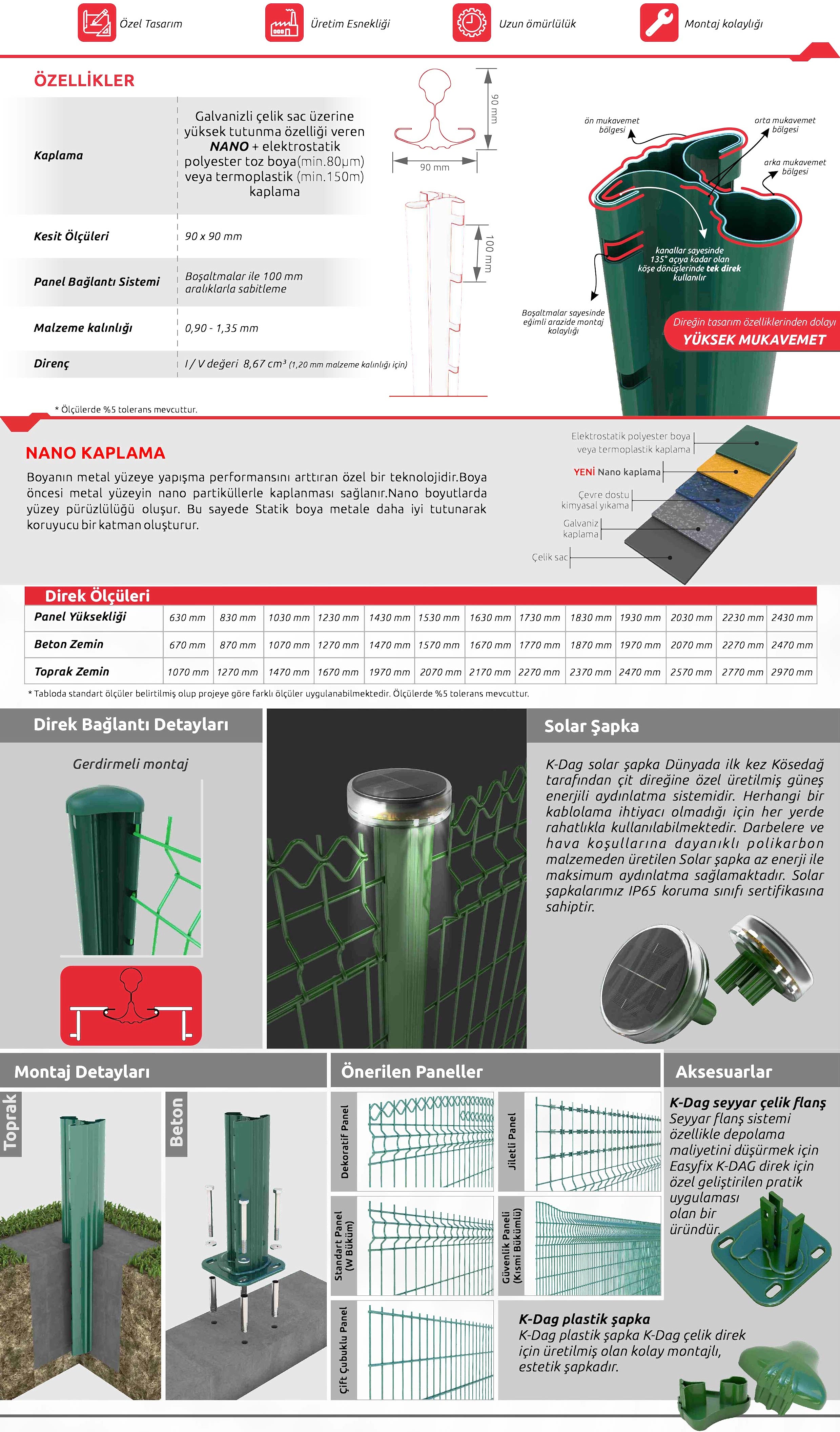K-DAG Metal Direk, özel kesit yapısı sayesinde panelin direk kanatlarına geçmeli şekilde montajını sağlayan, mukavemmeti arttırılmış direk sistemidir. Tüm panel çeşitleri ile uyumlu şekilde kullanılabilir. Çift katmanlı özel tasarımı sayesinde yüksek direnç, mukavemet ve montaj kolaylığına sahiptir. Direk kanatlarına geçme özelliği sayesinde bağlantı elemanı gerektirmez. Özel geçmeli sistem, panelin sökülmesini engeller ve dış güvenlik tehditlerine karşı ekstra koruma sağlar. Panelin direğe montajında delik delme işlemi olmadığı için korozyon direnci yüksektir. Uzun ömürlüdür.Tek bir sac levhadan üretilmesi ile kesme, kaynaklama, kelepçeleme vb. yöntemlere dayanan geleneksel tekniklerdeki kayıpları ortadan kaldırmıştır. Montajda delme işlemi gerektirmediği için kaplama zarar görmez. Direk kanatlarındaki boşaltmalar sayesinde eğimli arazilerde montaj kolaylığı sağlar. Köşelerde ve dönüşlerde ekstra direğe ihtiyaç kalmamaktadır. Standart sistemde plastik şapka ile kullanılan K-DAG Metal direkte alternatif olarak solar şapka eklenebilir.